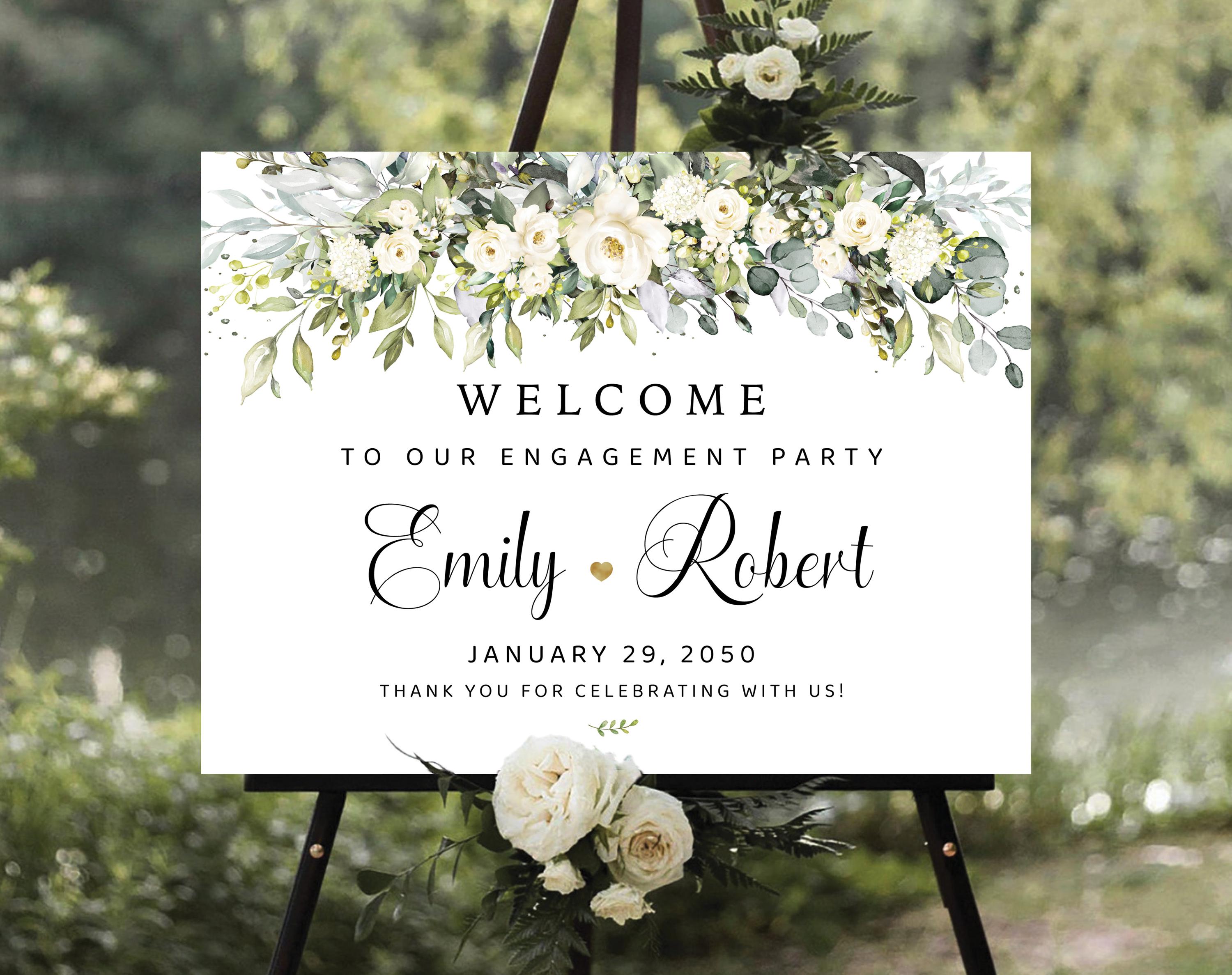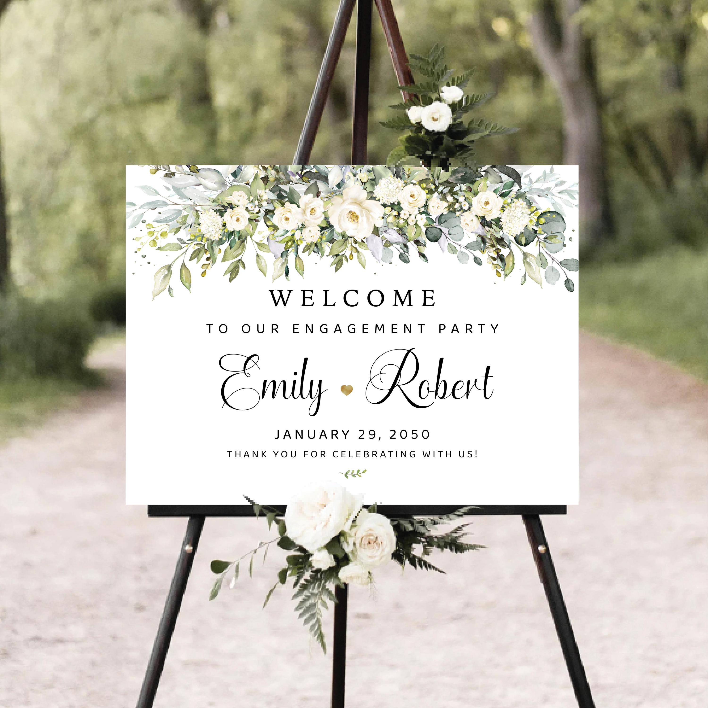 Floral Engagement Party Welcome Sign, White Flowers and Greenery, Botanical Engaged Poster (Digital Printable)